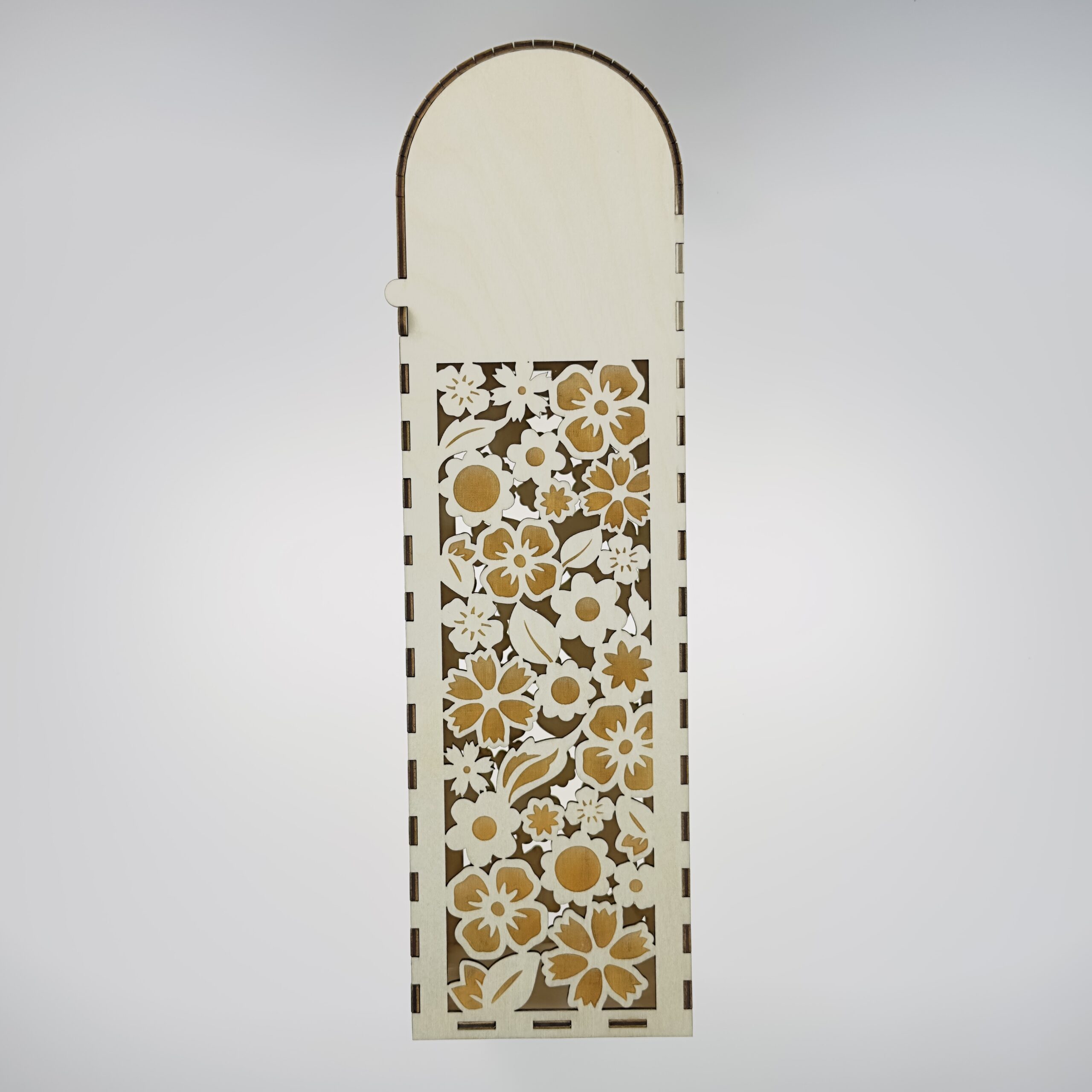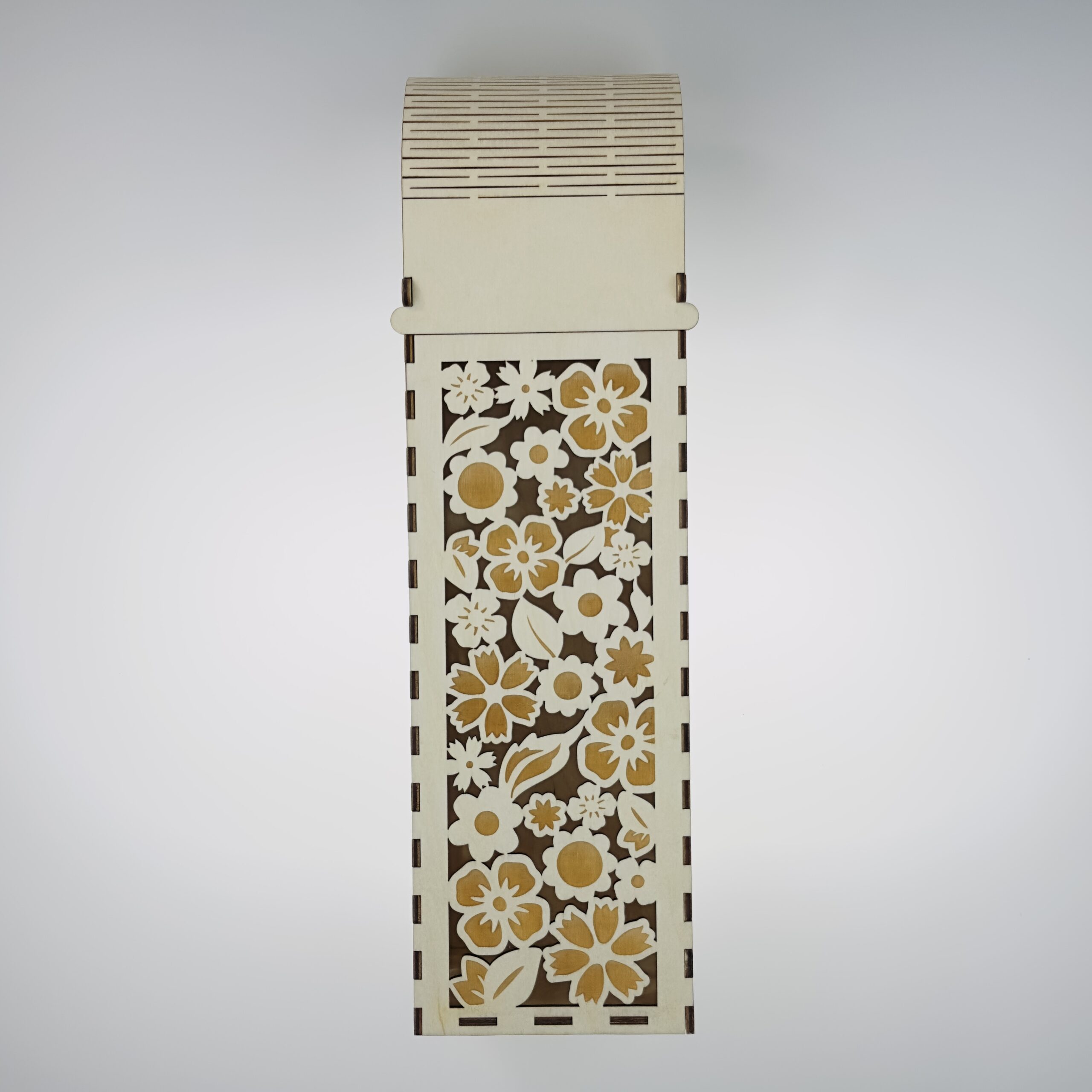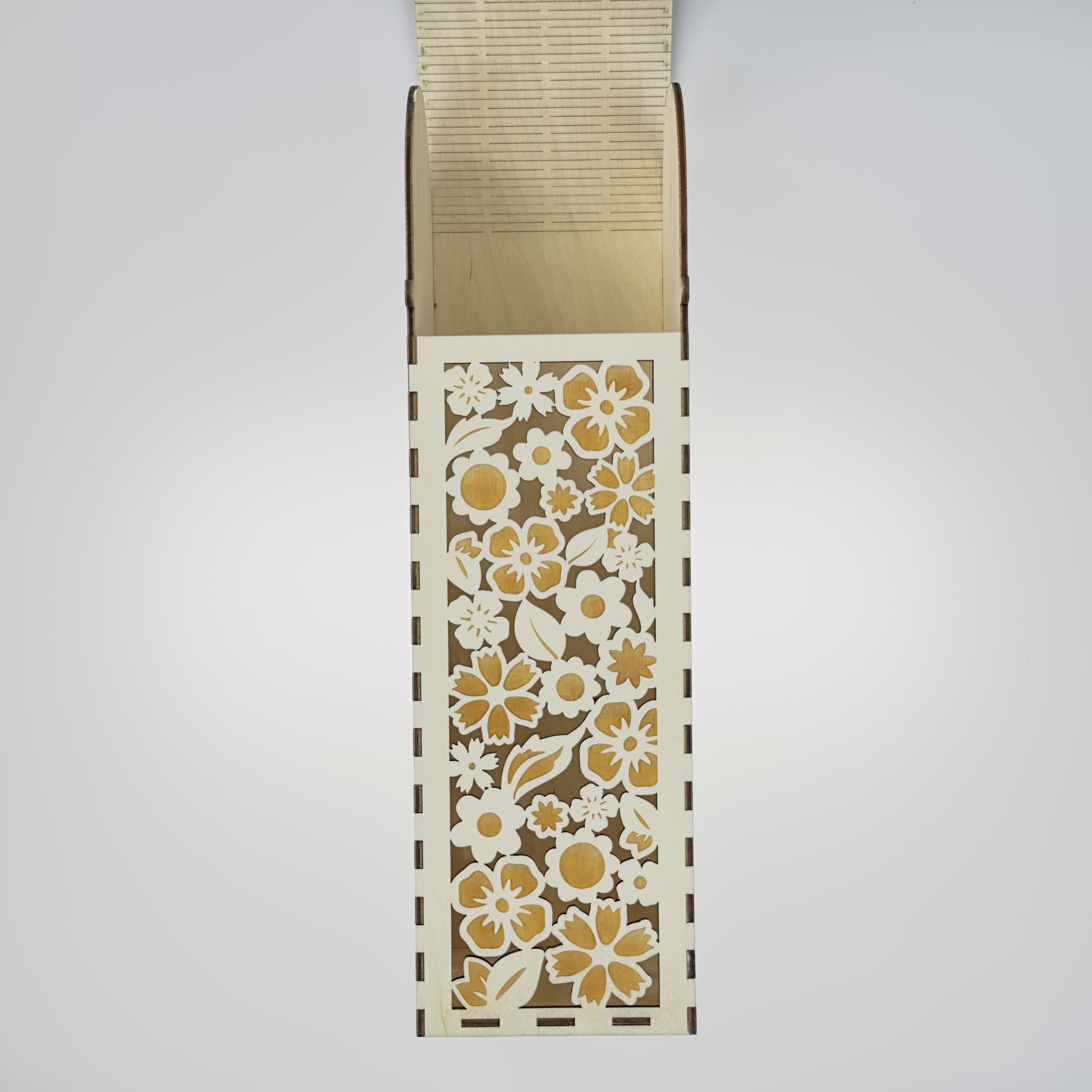 Stylowy i solidny pojemnik na alkohol, wykonany ze sklejki brzozowej o grubości 3 mm, zdobiony ażurowym wzorem kwiatowym. Idealny do zapakowania butelki wina, whisky lub innego alkoholu jako wyjątkowy prezent na ślub, urodziny, rocznicę czy inną uroczystość.