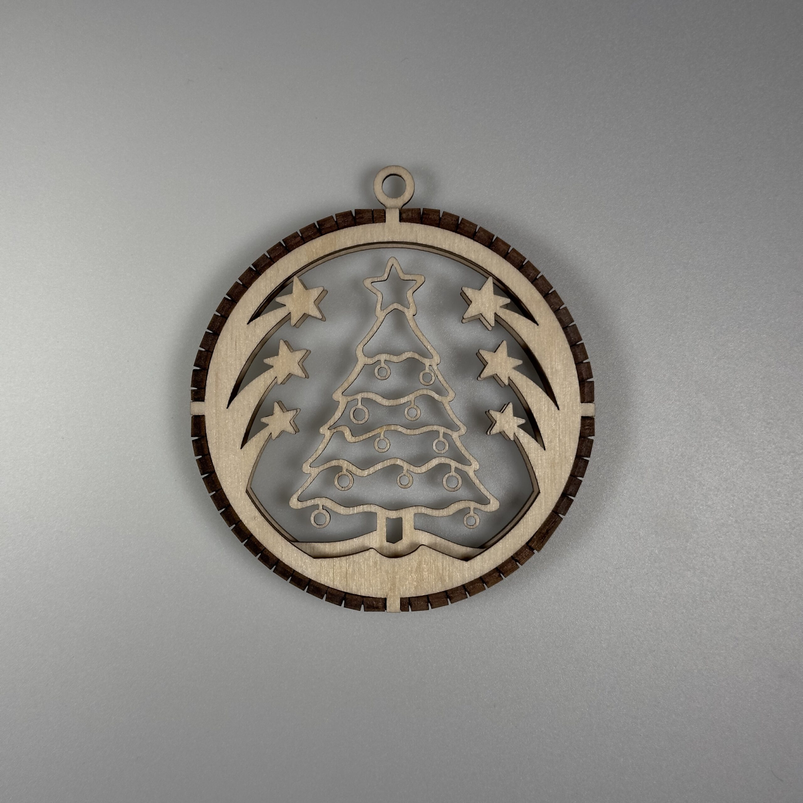 Elegancka, precyzyjnie wycięta ozdoba wykonana z naturalnej sklejki. Bombka posiada 3 warstwy które są połączone grzebieniem wyciętym z 3mm sklejki. W górnej części ozdoby znajduje się uchwyt który umożliwia łatwe zawieszenie na choice ścianie lub oknie za pomocą sznurka, wstążki oraz haczyka. Bomba jest staranie szlifowania dzięki czemu otrzymujemy gładką powierzchnie, dodatkowo pozbawioną nieestetycznych przepaleń.