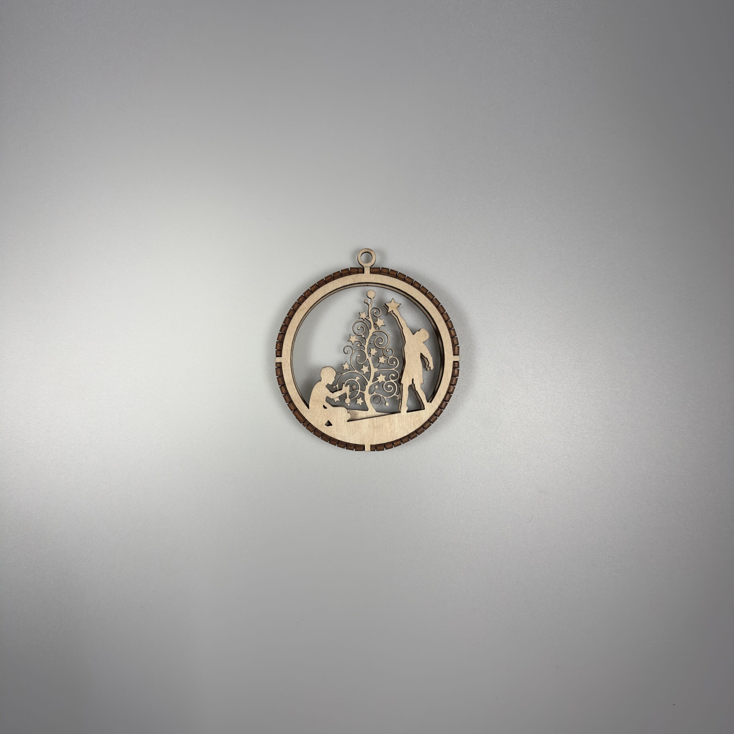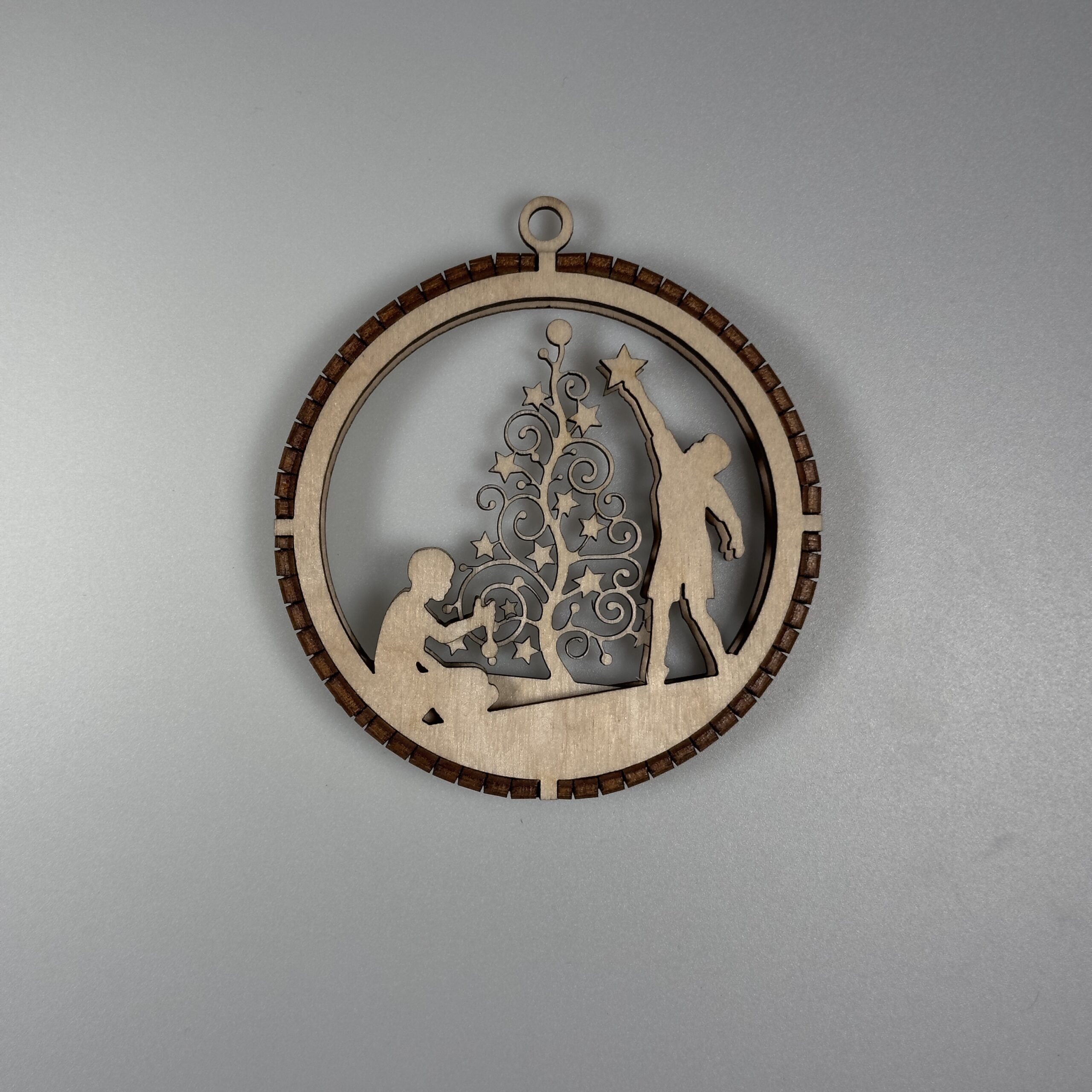 Elegancka, precyzyjnie wycięta ozdoba wykonana z naturalnej sklejki. Bombka posiada 3 warstwy które są połączone grzebieniem wyciętym z 3mm sklejki. W górnej części ozdoby znajduje się uchwyt który umożliwia łatwe zawieszenie na choice ścianie lub oknie za pomocą sznurka, wstążki oraz haczyka. Bomba jest staranie szlifowania dzięki czemu otrzymujemy gładką powierzchnie, dodatkowo pozbawioną nieestetycznych przepaleń.