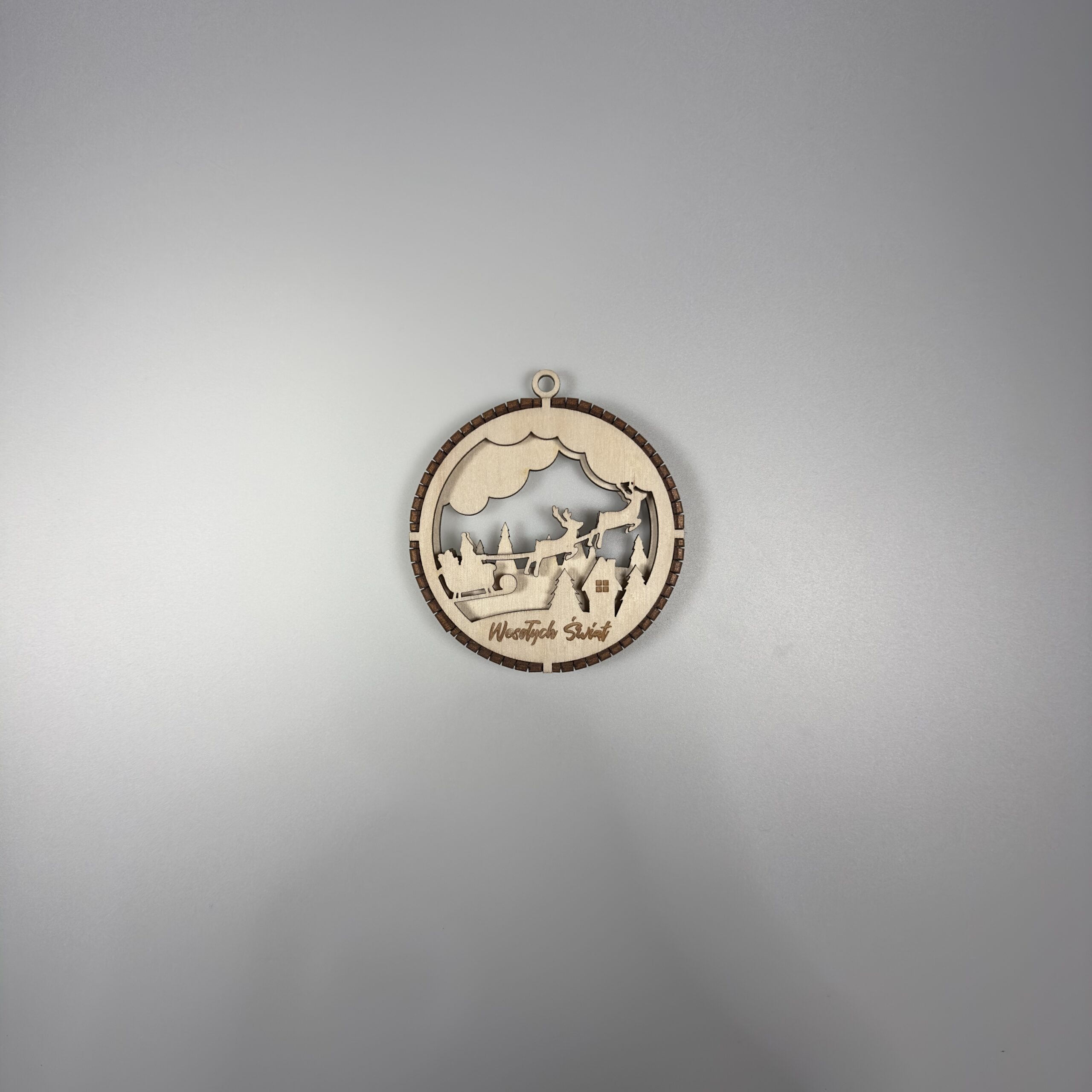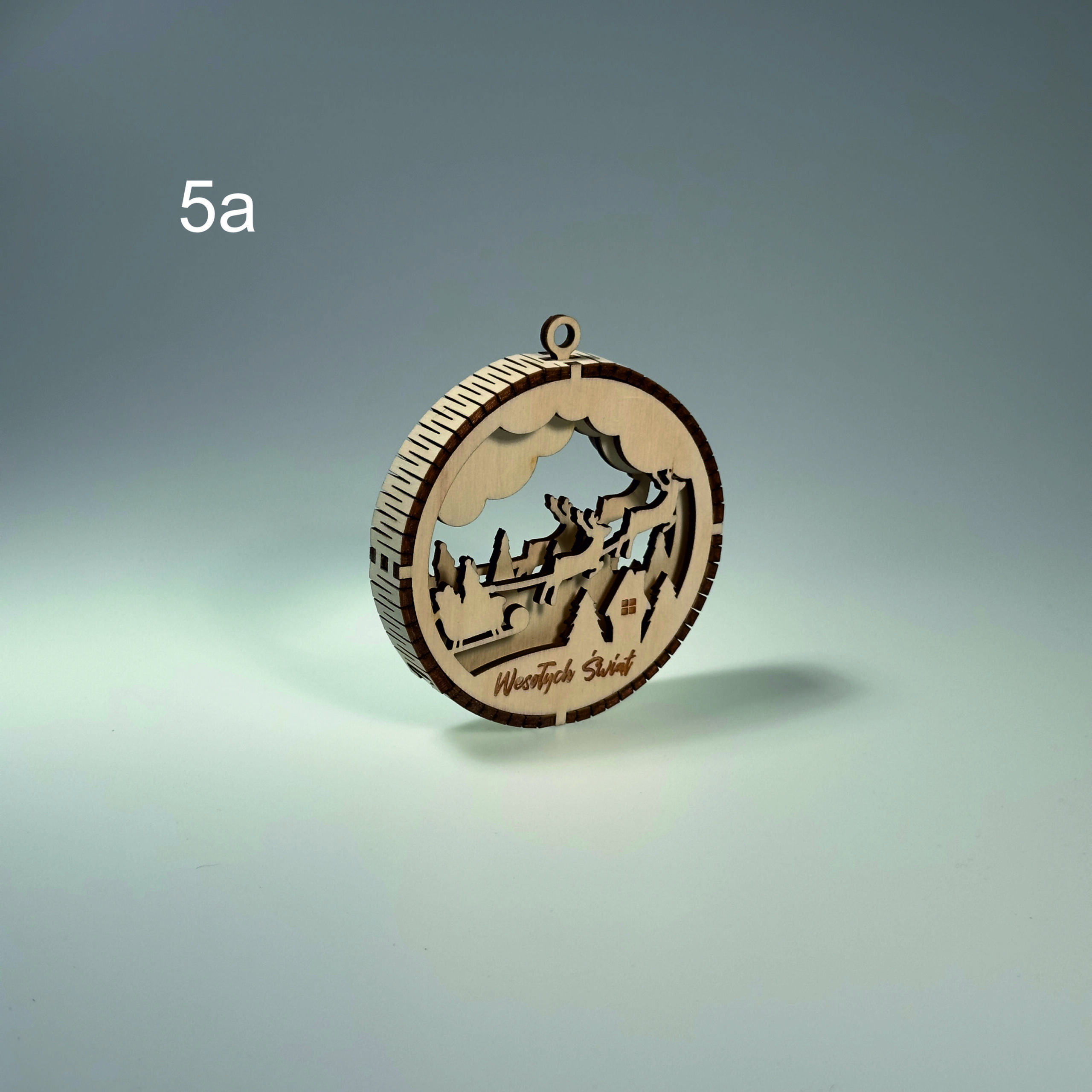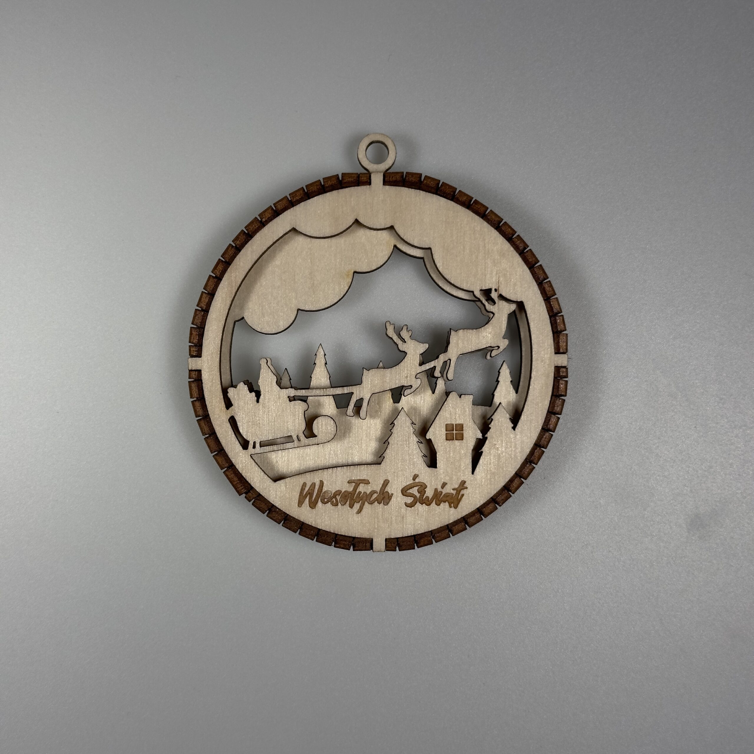 Elegancka, precyzyjnie wycięta ozdoba wykonana z naturalnej sklejki. Bombka posiada 3 warstwy które są połączone grzebieniem wyciętym z 3mm sklejki. W górnej części ozdoby znajduje się uchwyt który umożliwia łatwe zawieszenie na choice ścianie lub oknie za pomocą sznurka, wstążki oraz haczyka. Bomba jest staranie szlifowania dzięki czemu otrzymujemy gładką powierzchnie, dodatkowo pozbawioną nieestetycznych przepaleń.