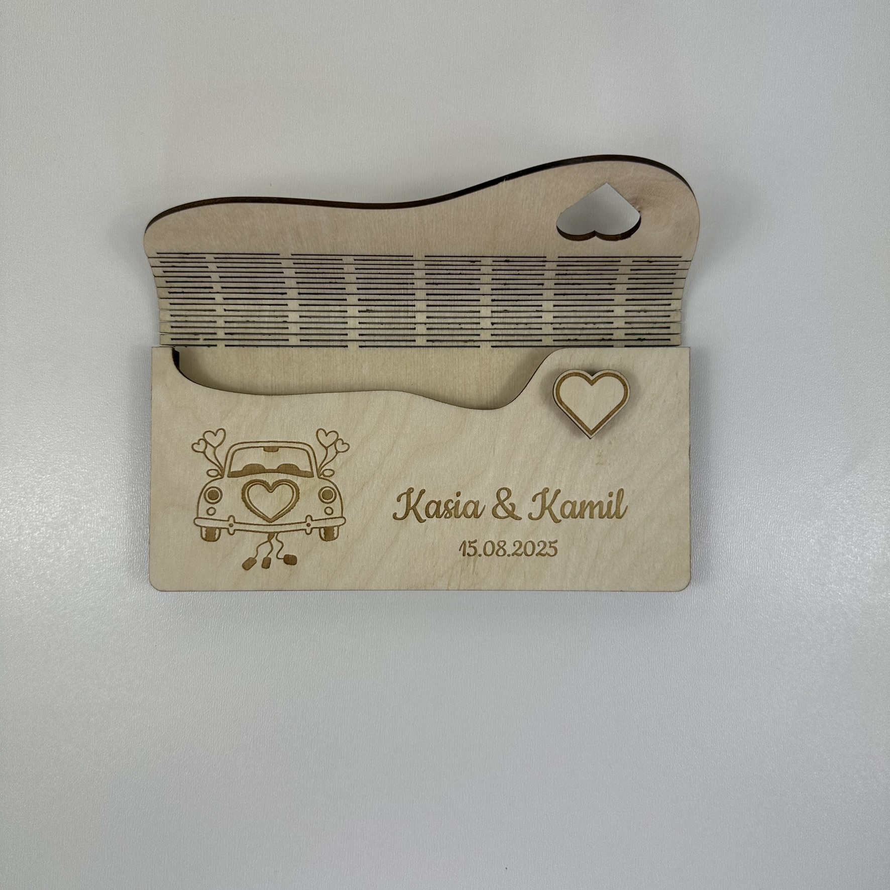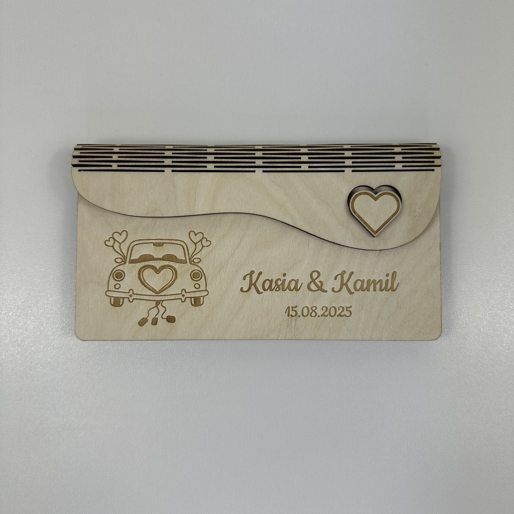 Elegancka i nietuzinkowa drewniana koperta na pieniądze, wykonana z wysokiej jakości sklejki o grubości 3 mm oraz 6mm. Idealna jako wyjątkowy sposób na przekazanie prezentu ślubnego lub wręczenie gotówki w dniu uroczystości. Personalizowana grawerem z imionami Pary Młodej oraz datą ślubu, wzbogacona romantycznym motywem samochodu i serca.