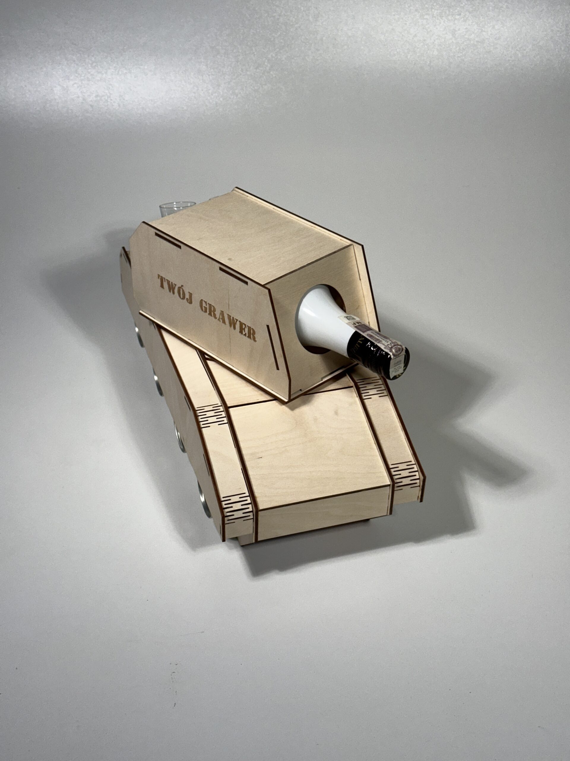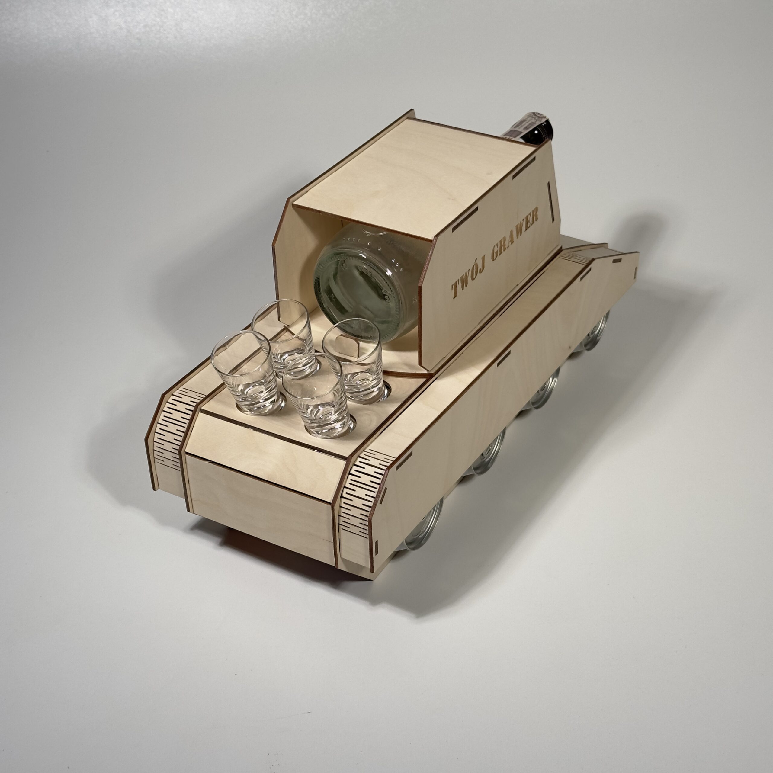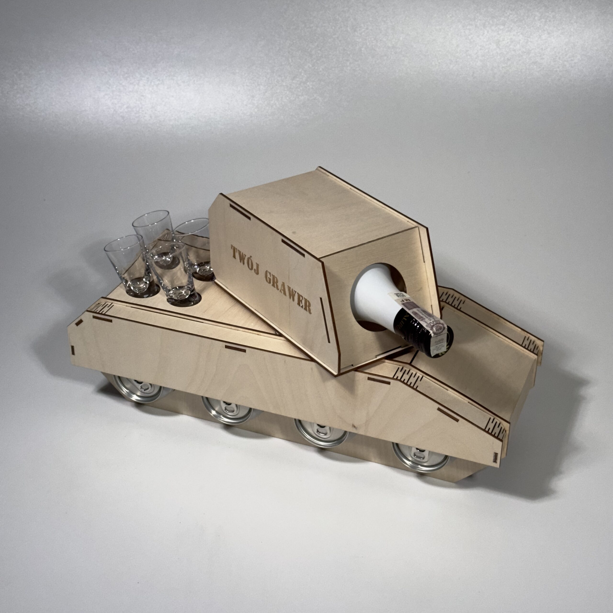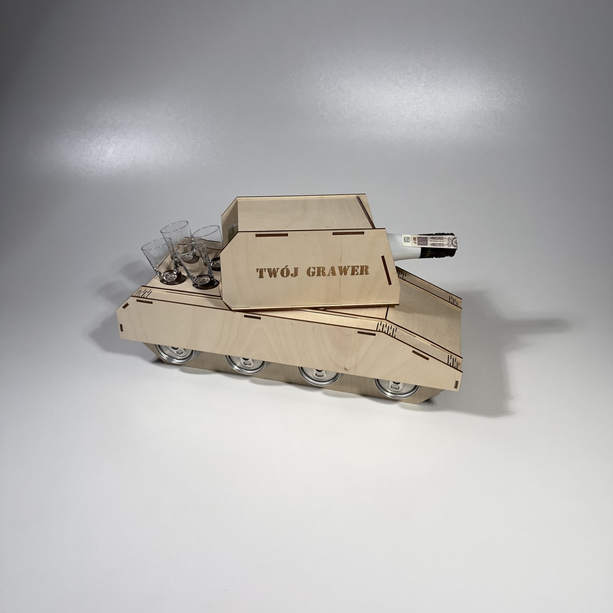 Drewniany Czołg to oryginalny i efektowny stojak na alkohol, który łączy funkcje prezentu z unikalnym designem inspirowany pojazdem wojskowym. produkt ten został wykonany z naturalnej sklejki 3mm, precyzyjnie wycinanej laserowo, co zapewnia wysoką estetykę, trwałość oraz idealnie dopasowanie elementów.