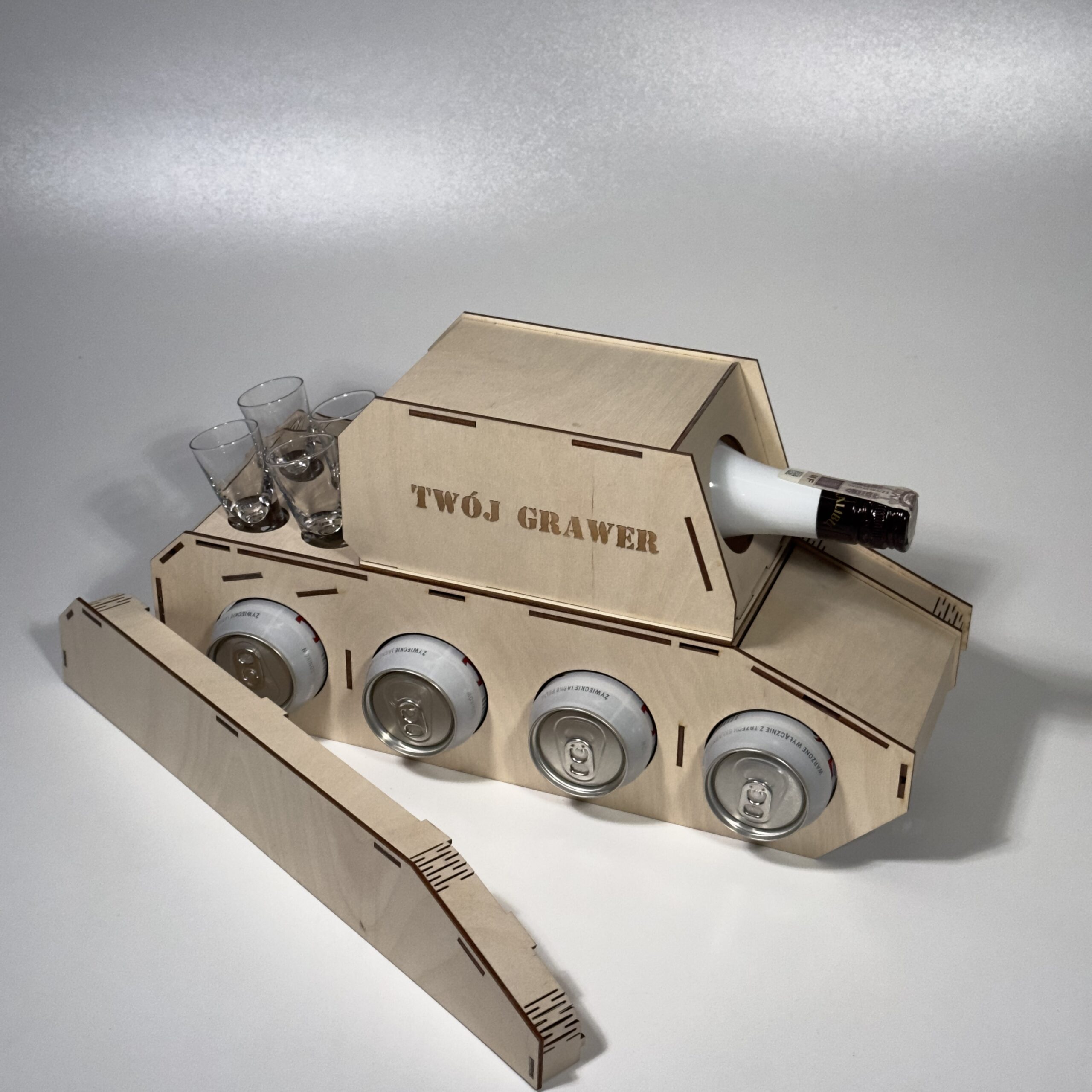 Drewniany Stojak na alkohol w kształcie czołgu. Mieści 4 puszki piwa, 4 kieliszki i butelkę 0,7l. idealny na prezent z możliwością personalizowanego graweru. Efektowny design i solidne wykonanie.
